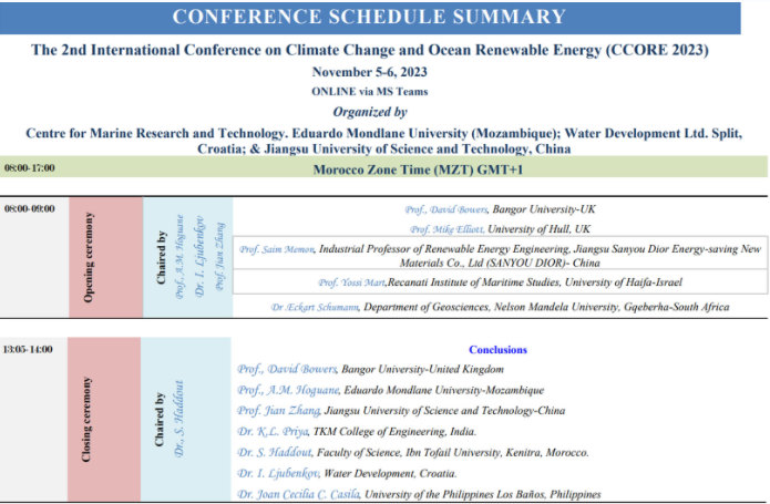 第二届气候变化与海洋可再生能源国际会议(CCORE 2023)于2023年11月5号举行,为期两天。本次会议由威廉希尔、莫桑比克爱德华多蒙德兰大学海洋研究和技术中心、克罗地亚水利开发有限公司共同主办。共有70人参加会议,其中有16位专家学者来自英国、加拿大、哈萨克斯坦等各个国家。williamhill中文副经理(主持工作)张建教授担任组委,应邀主持开幕式,并作闭幕式总结。